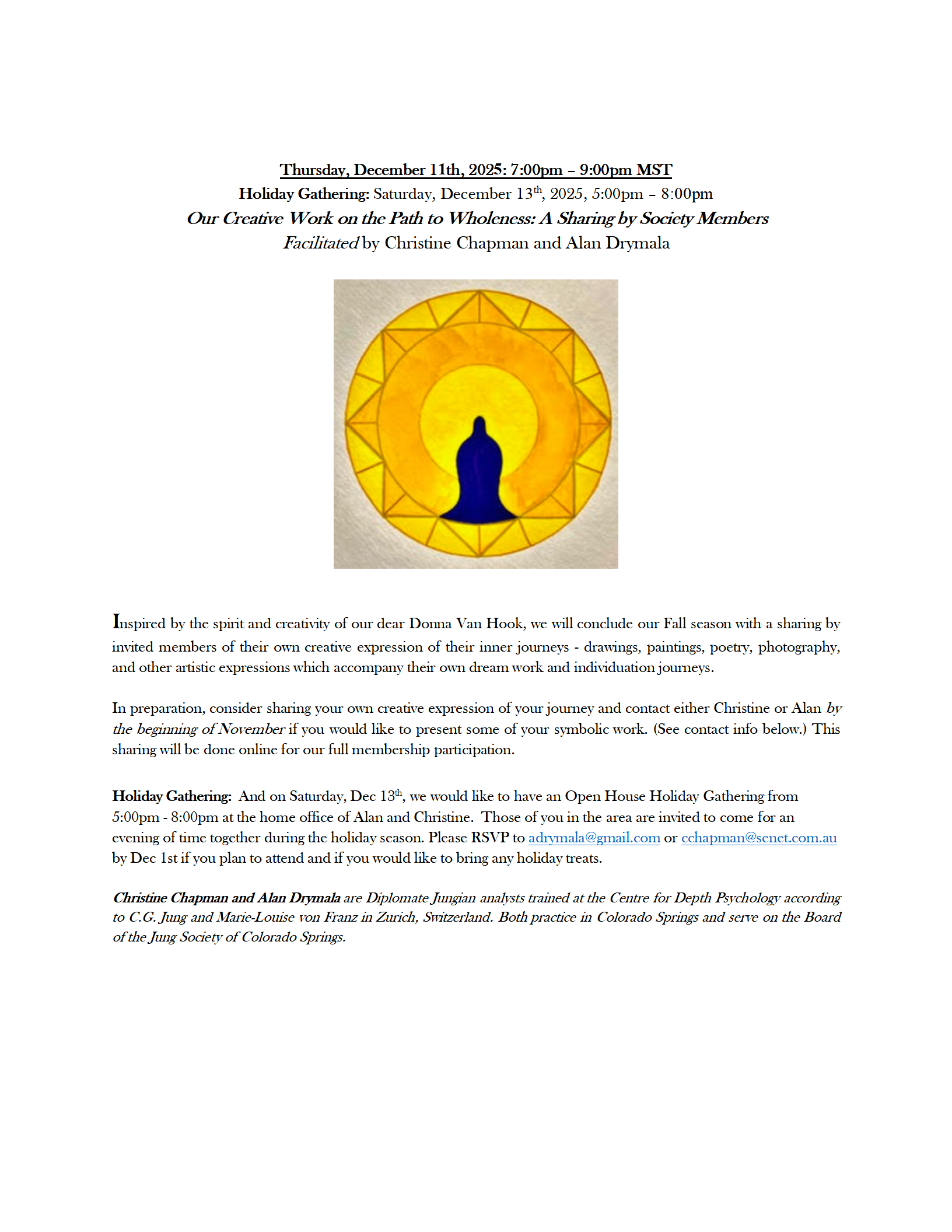 And we want to gather in person at some point, perhaps a summer event and certainly a Christmas in-person gathering so that we can have that community experience together again. We welcome your ideas and assistance on this! Finally, the recurring Zoom link for all our session is posted on our website, www.csjung.org, and the link will also be emailed out the day prior to each session. You can also use the PayPal link on our website to send in dues or presentation fees. Thank you all for your support in furthering Jungian wisdom and community!